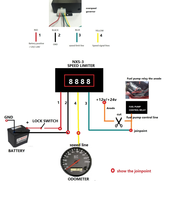 The green wire of vehicle speed limiter should be connected the fuel pump in the car. The other side which connect the fuse box should be cut off and reconnect with the green wire.